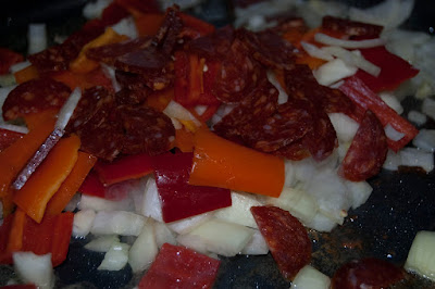 When the chicken has a good sear on each side (about 6 minutes on the first side and only about 4 on the second), set the chicken aside. Use the oil and chicken fat to fry up the onions, sausage, and peppers.
